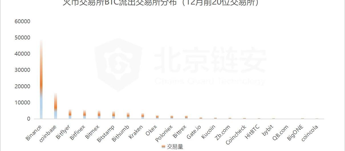 從構成來看,流入幣安的交易所更為多樣,而在12月份,火幣和OKEx都有較大比例數量的比特幣源自幣安,在流入火幣的交易所來源比特幣中,幣安更占去了接近5成的份額。接下來,我們進一步展示了HBO三大所比特幣流出去向。