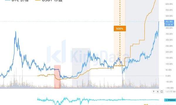 比特幣交易的場外資金在猛烈的增多,如下圖1所示,整個2020年,USDT增發多次,累計增發量超過500%,約從40億枚增發至200億枚,而據圖2分析可見,而USDT資金占據了比特幣交易量的近70%。