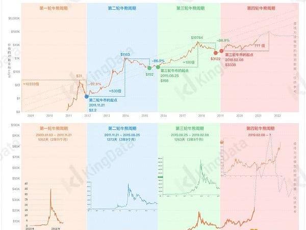 隨周期而動,是投資加密貨幣最理想的狀態,如圖所示,我們正處于第四輪牛熊周期中,根據K線指標來看,這輪周期仍值得期待。在第一輪牛熊周期中,比特幣漲幅10333倍,隨后回撤92.9%。第二輪牛熊周期漲幅530倍,隨后回撤86%。第三輪牛熊周期中漲幅100倍,隨后回撤86.9%。我們正處于第四輪牛熊周期的價格上漲趨勢中,漲幅最高點和回撤點還無法預測,也因此值得期待。