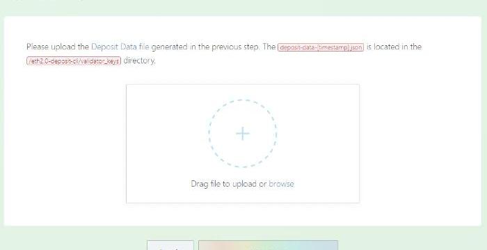 你會被要求上傳deposit_data-.json文檔。這個文檔你是在步驟1生成的。瀏覽/選擇或拖拉這個文檔,然后點擊Continue。