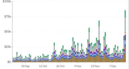 在比特幣到達2萬美元之前,比特幣的價格與交易量一直走勢平淡。至12月16日,比特幣的價格依舊維持在19,000美元左右,而交易量也一直未超過30億美元/天。就在投資者們認為“今年就這樣吧”的時候,比特幣已經悄悄積蓄好了力量。12月16日開始,比特幣價格開始快速上升,在21點42分突破了20,000美元。市場沸騰了:比特幣日交易量大幅跳升至100億美元,達到30天內最大交易額;而價格也沒有停下,截至發稿前,比特幣價格一度達到23,652美元,并穩定在2萬美元線以上已達40小時。
