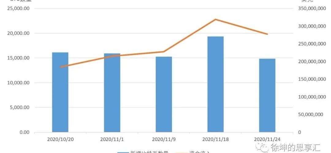 注:總持倉量=單資產信托持倉量+大盤基金持倉量需要注意的是,灰度并不直接公布持倉幣的數量,而是會定期更新信托份額的總量,以及每份對應多少相應的數字資產。目前的市場所披露的灰度持倉情況都是以“持倉量=已發行份額數*單位份額持倉量”這個公式計算得來。目前已在OTC市場掛牌的6個品種每個交易日會在官網產品介紹頁更新“已發行份額數”和“單位份額持倉量”,因此可以逐日計算持倉變化,而ZEN、XRP、XLM、ZEC這4個品種,灰度每日在官方推特更新總規模及單位價值,但發行份額和單位持倉量更新頻率約為一個月,因此以上述公式追蹤的持倉量變化具有一定的延遲性。2020年至今,灰度比特幣信托新增持倉約25萬個,比特幣年內新增流通量約42萬個,而以減半之后來計算,灰度新增持倉與新挖出來的比特幣基本持平。