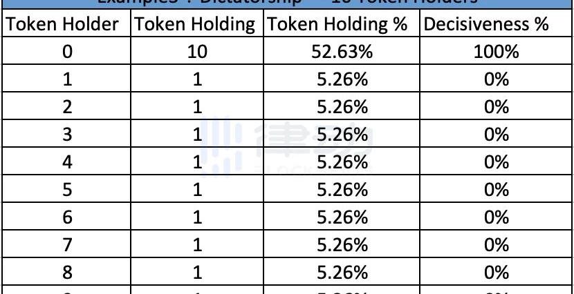 在第三種分布下,共有10名持幣者,持幣者0擁有52.63%的總代幣量,其余持幣者各擁有5.26%的代幣。在這種情況下持幣者0對協議有著絕對的控制權,其決定性為100%。其余持幣者對于協議沒有任何決定性。治理代幣分布四:絕對決定性