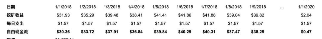 在當今市場中,算力價格主要由比特大陸、比特微和嘉楠耘智等硬件制造商控制。他們占據新礦機的絕大部分市場份額,完全控制著挖礦算力硬件的初始發行權。制造商的首要任務是保證生產能回本,這與加密貨幣市場關系不大,而與供應鏈管理關系更大。他們的產品銷售價格可以根據市場需求進行調整,但必須要保證有一定的生產利潤。有時制造商會人為地壓低價格,使其價格超過競爭對手。簡而言之,制造商的定價并不代表算力的理論公允價值。其中摻雜了反映礦機制造企業狀態的外在因素。在算力煉金術第一篇《讀懂哈希率「煉金術」:比特幣算力資產的特征與挑戰》一文中,我們討論了評估算力最流行的指標是靜態的盈虧打平天數。該指標考慮BTC當前的即時價格、挖礦難度、費用和全額運營支出,可以衡量多少天才能使所購礦機達到收支平衡。每個礦工在同一款礦機上有不同的回本天數,因為每個礦工經營方式不同。礦工基于其所采用的電費和裝機容量的電費成本來計算自己的回本天數。但礦機制造商無法將所有礦工的成本都考慮在內,因此,回本天數計算的起點是整個市場的平均電費成本。由于收集各個礦工電費數據極具挑戰性,整理出的平均成本只能是個粗略的估計,況且該電費成本亦隨季節更迭隨時在變化。成本結構不同的礦工如大浪淘沙榮辱興衰。礦機制造商在對電費成本進行最佳猜測的情況下做該計算,并根據合理的回本天數范圍來敲定礦機的價格。但是礦機制造商用作輸入參數的全行業電費成本是多少?我們可以用礦機歷史價格數據對其進行反向測算。我們可以使用折現現金流量法,對礦機歷史價格進行回溯測試,以找出制造商為礦機定價時的底層假設。例如螞蟻S9礦機在2018年1月的零售價為2,675美元。假設螞蟻S9礦機的生命周期為24個月,我們可以算出一臺礦機的歷史收入: