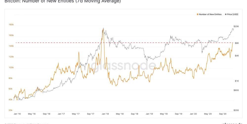 比特幣區塊鏈上的活躍交易者數量在整個2020年都在穩步增加,目前每天的活躍交易者數量已經接近40萬個,距離之前的歷史最高點還差不到4%。它只在2017年年底的牛市期間有一次高于目前的水平。