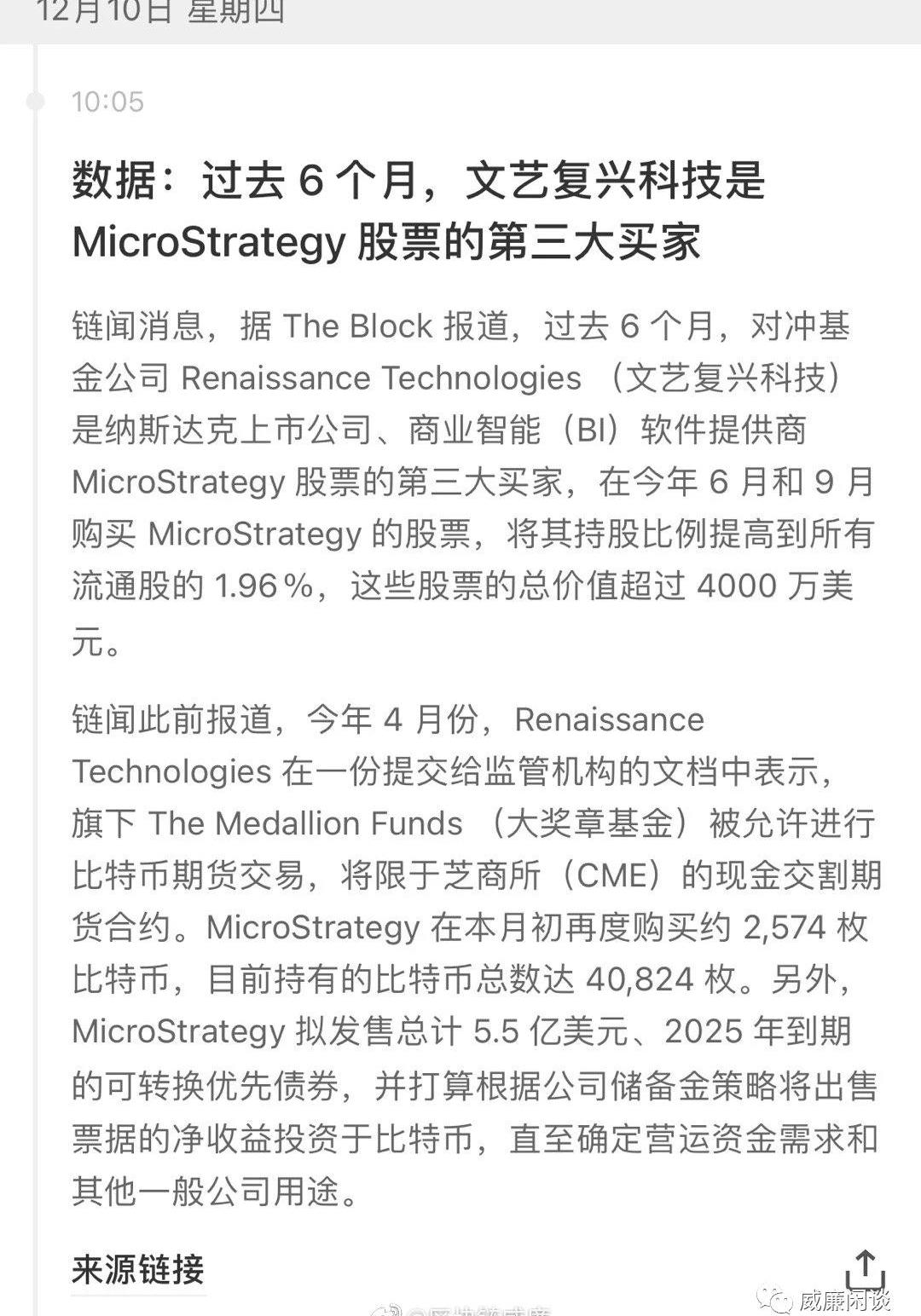 這估計是比較早的圖了,大家湊合看吧。蘋果現在的現金儲備應該已經到了2000億美金這個規模了,特別可怕。總之,未來會不會有下一個Microstrategy?顯然,一定會的。就像當年業績不行的公司只要宣布自己"轉型區塊鏈"就能暴漲一樣,未來會出現一個局面,就是業務不行的企業,只要把從銀行拿來的壓根不要成本的現金,買入比特幣,股價就能漲了。這事兒,我覺得可行,估計老美那些上市企業已經提上議程了吧?買不買不重要,討論討論總要的。畢竟隔壁有個公司買了比特幣股價漲了好幾倍,不能不心動嘛。更有趣的是,華爾街傳奇基金文藝復興似乎也加入這個“循環”里了: