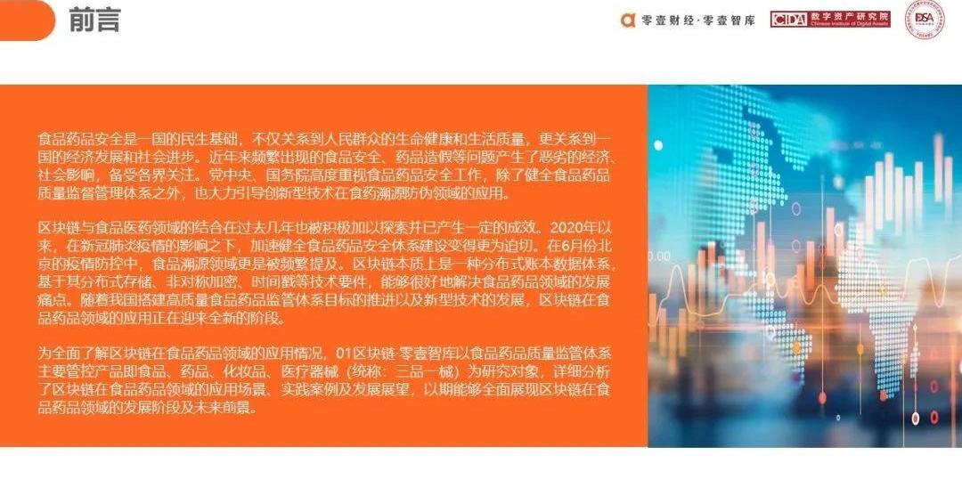 XRP/HKD+0%編者按:本文來自01區塊鏈,Odaily星球日報經授權轉載。食品藥品安全是人民群眾安居樂業、經濟社會平穩發展的基礎保障。但在利益驅使之下,食藥領域安全事故頻繁發生,給民眾的生命健康帶來了巨大威脅,產生惡劣的經濟、社會影響。國家藥品監督管理局統計數據顯示,從2016年-2019年,藥品、醫療器械、化妝品三類產品的投訴舉報事件整體呈現上升趨勢,其中,藥品領域的投訴舉報事件更是以每年10%的速度在增加。區塊鏈基于其分布式存儲、非對稱加密、時間戳等技術要件,能夠很好地解決食品藥品領域的安全問題。2020年上半年以來,湖南、貴州、海南、江蘇等四個省份以及廣州、寧波、長沙等八個城市發布區塊鏈扶持政策,均提及推動區塊鏈技術在食品藥品溯源領域的應用。區塊鏈在食品藥品領域的應用正迎來全新的發展階段。區塊鏈技術之于溯源領域不僅是一項技術革新,更重要的是提供了一種產業鏈治理理念和溯源商業模式。利用區塊鏈技術可用較低成本實現對產業鏈條的各參與主體的資源整合從全產業鏈角度進行全局統籌管理改變過去用其他技術手段進行的局部改造。同時基于區塊鏈的數據治理能力將能使溯源鏈條完成從事后被動監管到主動的、基于信用的事前和事中監管提升溯源時效性和實施效果。為全面了解區塊鏈在食品藥品領域的應用情況,01區塊鏈·零壹智庫聯合數字資產研究院、中國食品藥品企業質量安全促進會區塊鏈專業委員會、中國投資協會數字資產研究中心推出《區塊鏈在食品藥品領域應用探索報告》。該報告以食品藥品質量監管體系的主要管控產品即食品、藥品、化妝品、醫療器械為研究對象,詳細分析了區塊鏈在食品藥品領域的應用場景、實踐案例及發展展望,以期能夠全面展現區塊鏈在食品藥品領域的發展現狀及未來前景。以下為報告內容: