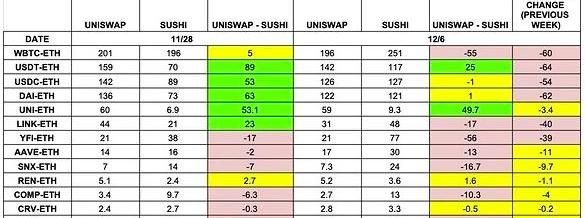 Uniswap社區成員@Shawman貼出的一張圖表顯示,11.28-12.06期間,四大池以及包括ASSY在內的多個主流DeFi幣種對ETH交易對的流動資金正在從Uniswap轉移至Sushiswap,這其中甚至包括UNI-ETH交易對。在Sushiswap步步緊逼的同時,Uniswap的“續挖”提議似乎停滯了,距離通過共識檢查已過去了十天,但正式治理提案卻遲遲未能發起。