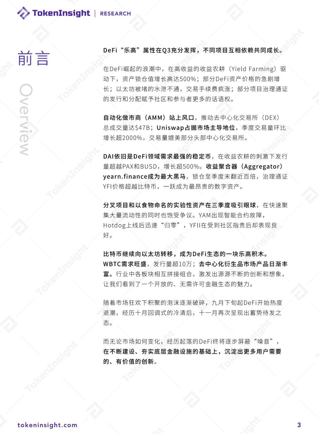 1.DeFi在三季度發展依舊強勢,總鎖倉量較二季度增長500%,達$11.4B。十月DeFi市場相對轉冷,月末鎖倉量與月初基本持平,DEX整體交易量回落,十月下降34%;2.DeFi的火爆將以太坊手續費推上9月初平均$14/筆的歷史高峰,DeFi表現受yearn.finance等熱點項目和事件驅動明顯;3.預言機項目Chainlink長期位居DeFi市值榜單第一。市值前十的DeFi項目平均回報率為89%,半數表現超以太坊;4.AMM驅動DEX交易量增長,三季度DEX總成交量達$47B,為歷史總成交量的4.2倍,較二季度環比增長1,155%;5.收益農耕帶給參與者的高收益在短時間內吸引了大量流動性和用戶,但農耕收益下降是必然趨勢,熱度褪去流動性增長也逐漸停滯;6.分叉項目發展初期與原項目搶奪市場,呈現“此漲彼跌”的趨勢,但長期來看難以對原項目產生本質上的地位撼動;7.衍生品領域仍由合成資產主導。整體鎖倉值較二季度增長169%,達$293M,占DeFi總鎖倉值比例由季度初的15%下降至季度末的7%,九月下旬熱度退潮趨勢較借貸和DEX明顯。