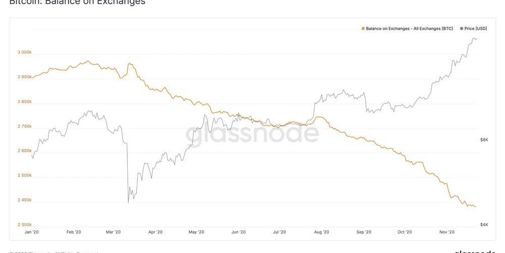在過去的幾個月里,LTC也回到了前十名的位置,從八周前的第12名徘徊到現在的第6名。BTC交易所流動性繼續走下坡路從2020年初開始,交易所的BTC數量幾乎呈持續下降趨勢,全年下降了近20%。10月以來,隨著BTC價格的陡然上漲,比特幣從交易所撤出的速度更快。