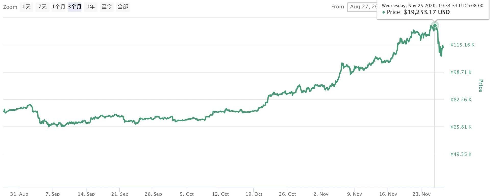 自今年3月開始,比特幣從最低點約4000美元,一路上漲突破2019年、2018年新高,最高沖至1,9400美元,逼近歷史高點19783美元(2017年12月)。比特幣上漲的趨勢未變,可知離突破歷史新高只差臨門一腳。