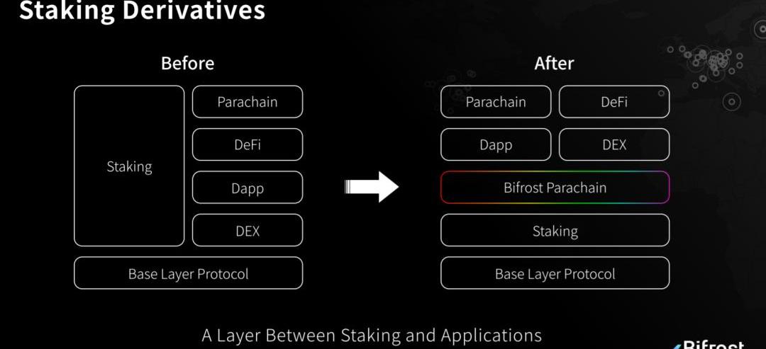 Staking雖然提升了公鏈安全性,讓用戶獲得了收益。但解除Staking一般都有時間限制,這會讓用戶承擔很大的機會成本及市場風險。隨著DeFi的興起,為用戶提供了更多高收益的渠道的同時,這又會出現DeFi與Staking爭搶資產的情況。Staking收益低會導致代幣流向DeFi,降低網絡安全性;Staking收益過高,將會增加通脹,造成多方面負面影響。目前市場上已經有不少玩家在探索以上問題的解決方案,中心化和去中心化方案都有。區哥認為去中心化的解決方案可能更容易被廣泛接受。具體來說,用戶通過中間層進行Staking,由中間層發行對應抵押資產的憑證,該憑證在獲取Staking收益的同時,還能在市場上交易、流通。比較重要的一點是,這一流程是由去中心化網絡實現的,因為相比不同的機構推出的互不兼容的解決方案,去中心化的解決方案因為標準統一、去中心化,將可能更容易被市場接受。流動性解決方案的推出,讓用戶既保持了流動性也獲得了Staking收益,同時還會對原本不想參與Staking的用戶產生吸引力,這將會提升抵押率,繼而提升網絡安全性。Staking與DeFi爭搶資產的情況也不會再出現。同時更加重要的是,我們需要知道這些Staking資產的流動性被釋放之后,會去往哪里?從目前看除了DeFi并沒有別的好去處。這也將會實現區哥之前文章里說過的,萬鏈盡歸DeFi。目前Staking鎖倉資產有160億美金,通過流動性解決方案Staking資產鎖倉量有望繼續攀升。那我們想一下,這些新的資產進入到DeFi領域又會對現有DeFi生態產生哪些影響?要知道目前DeFi市場的真實鎖倉量才剛剛突破100億美金。接下來我們看一下這個賽道都有哪些玩家,以及又有哪些玩法。一、Bifrost