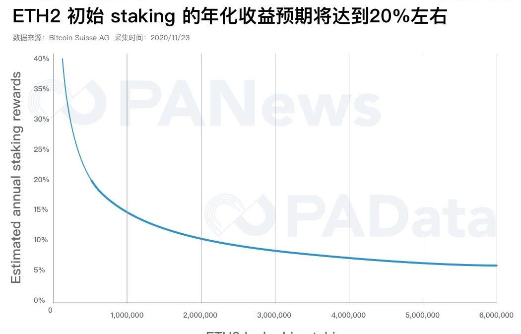 再看ETH2質押收益,根據BitcoinSuisseAG的測算,質押總額與質押收入之間呈現冪次關系,也即隨著質押金額的不斷增長,質押年化收入隨之下降。而ETH2的初始質押年化收入預計在20%左右,Staked給出的ETH2預期質押年化則達到了25.82%。按照20%的預期年化來計算,運營一個驗證節點,即質押32ETH的預期年化收益約為6.4ETH,如果通過第三方服務商完成質押,還需要支付一定的手續費,那么預期年化收益將低于6.4ETH。