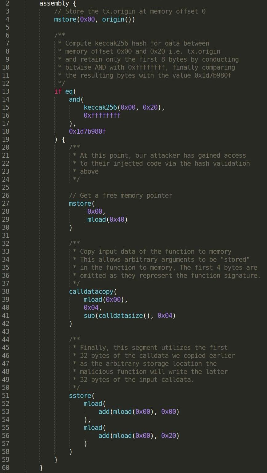 此函數允許特定地址通過底層調用根據其傳入的參數對合約進行任意寫入。帶注釋的assembly模塊如下所示: