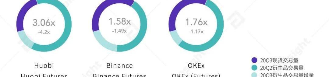 20Q3大型綜合交易所衍生品逐日成交量,來源:TokenInsight大型綜合交易所在現貨業務方面的擴張優勢以及衍生品行業的競爭導致了本季度衍生品成交量占比的下降。HuobiFutures衍生品成交量為現貨成交量的3.06倍,占其總成交量的75.4%,為衍生品業務比重最大的大型綜合交易所。Binance和OKEx衍生品成交量占其總交易量則分別為61.2%和63.9%。和上季度相比,三家交易所衍生品交易量占其交易總量之比均下降超10%。就增長而言,Binance本季度日均成交總量較上季度環比上漲42.5%,遠超市場平均。HuobiFutures和OKEx日均成交量增長則低于市場平均,達19%和15.5%。“第三季度受到DeFi影響,用戶觀望情緒較重,大型機構逐漸購入并持有主流資產,并沒有再用其投資其他數字資產。”霍比特HBTCCEO巨建華