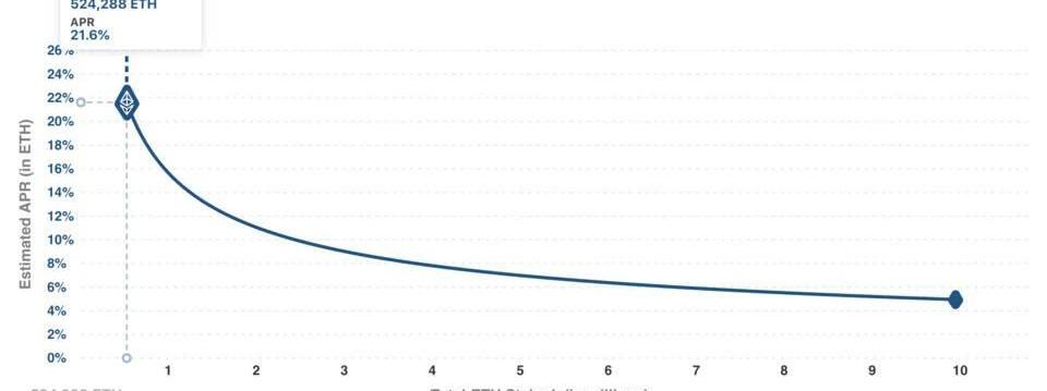 如果質押量達到了信標鏈最低上線標準的524,288ETH,則這部分驗證人可以獲得年化收益率約為21.6%,隨著驗證人數量增加,APR也會逐漸降低,最低為4.9%。