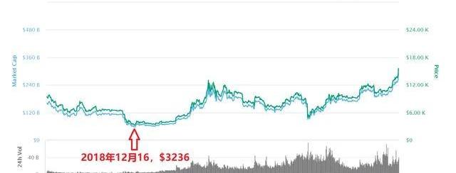 這是比特幣在上一輪牛市中后期的走勢圖,其中有兩個價位點值得我們注意:一個是2017年的1月1日911美元,另一個是2017年11月3日的5950美元。而上一輪牛市之前,比特幣的最低值是2016年1月18日的199美元。因此,從歷史數據看上一輪牛市比特幣的整體走勢大概分為三個階段:第一個階段是從2016年的1月18日開始到2016年的12月30日,經過大概2年的時間比特幣慢慢從底部的199美元恢復到911美元,幣價漲了4.6倍;第二個階段是從2017年1月1日開始到2017年11月3日,經過10個月的鞏固走高,比特幣從911美元漲到了5950美元,幣價漲了6.5倍;第三個階段是從2017年11月3日到2017年12月17日,在短短一個月多一點的時間,比特幣從5950美元漲到了19926美元,幣價漲了3.3倍。歷史不會簡單的重復,但歷史基本會踩住類似的節奏。任何一個牛市基本上都包括三個階段:恢復整固、穩步增長、瘋狂爆拉。上一次比特幣的牛市是如此,下一輪依舊會如此。我們再來看本次行情中比特幣的走勢圖。