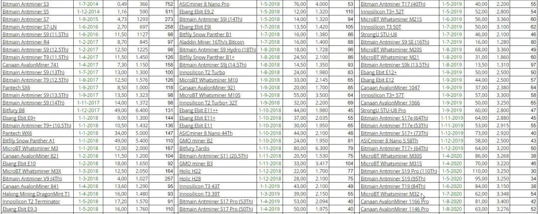為了考察挖礦設備的效率,我們將過去和現在市場上出現的所有設備都放在了一個表格里進行比較。這些都是AsicSHA256礦機。效率是以達到1Terahash/s的算力需要多少功率來表示。