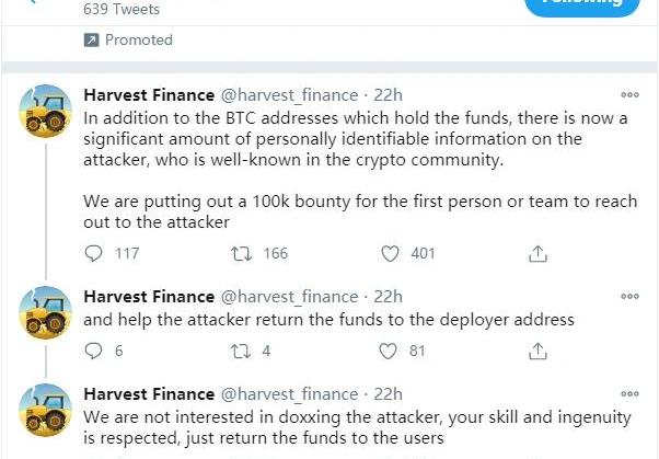 損失慘重的Harvest懸賞10萬美金亡羊補牢,獎勵首位成功和攻擊者取得聯系并幫助返還用戶資金的個人/團隊。項目方發推稱,除了持有被盜資金的BTC地址,還獲取了大量關于攻擊者的個人身份信息,攻擊者在加密社區頗為有名。