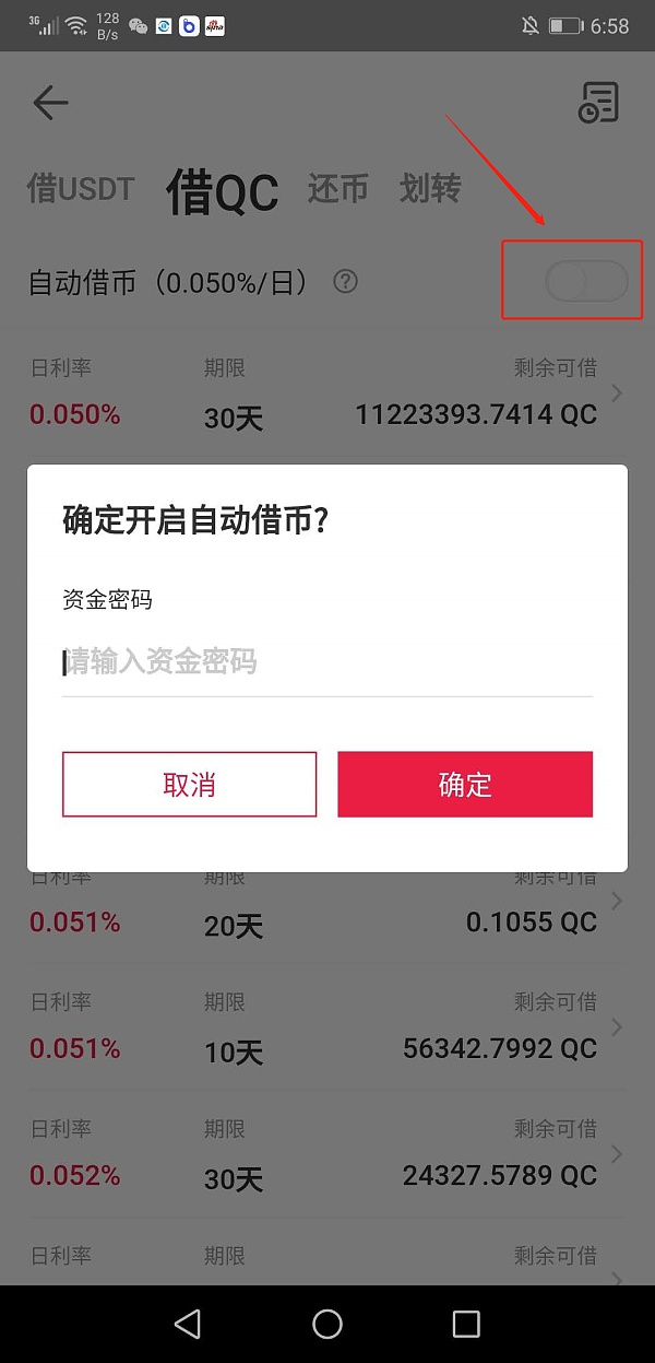 3、點擊自動借幣開關按鈕,輸入“資金密碼”,點擊“確定”即為操作成功。