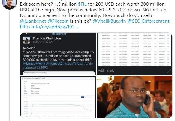 10月16日,即Filecoin主網啟動第二天,就有Filecoin社區成員透露,有未知賬戶突然在10月15日獲得150萬枚FIL代幣并轉向交易所。而根據解鎖方案,早期投資者、官方和礦工第一天解鎖量應該只有50萬枚。