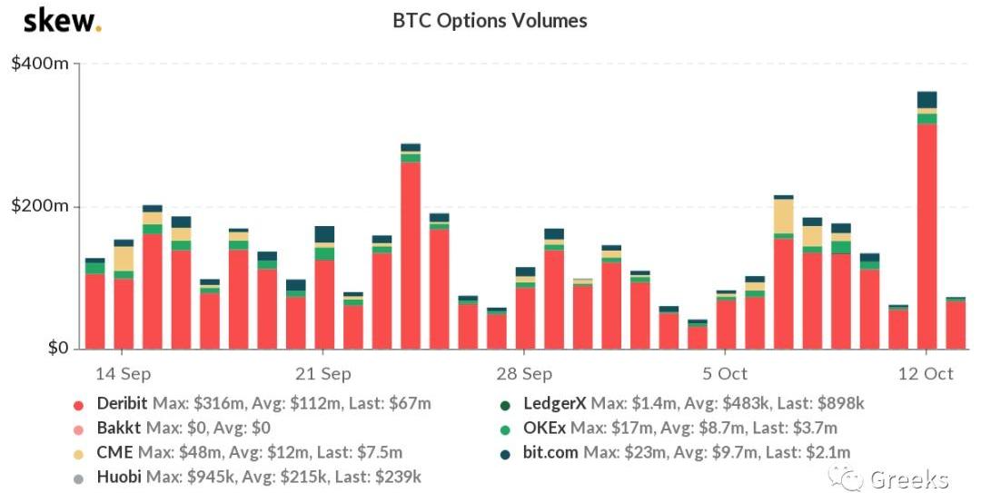 BTC歷史波動率10d27%30d35%90d49%1Y80%期權持倉量15億美元,期權成交量3.16億美元。成交量爆發增長,是平日的兩倍以上,僅次于7月27日長陽線當天的成交量。