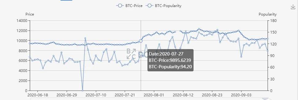 圖5.Source:realclearpolitics.com民調顯示,特朗普的支持率自8月16日低點后企穩回升,上升角度明顯大于拜登的支持率。這在一定程度上會提振資本市場對于美國市場的信心,美股企穩后,大概率會帶動數字貨幣市場企穩。加密資產市場引申到數字貨幣,上周期待整體趨勢在低位調整后快速反彈脫離弱勢區域的期待破滅,數字貨幣整體走勢也進入到將持續的弱勢整理中,BTC人氣跟隨價格下跌,價格進入橫盤狀態。BTC人氣價格對比圖