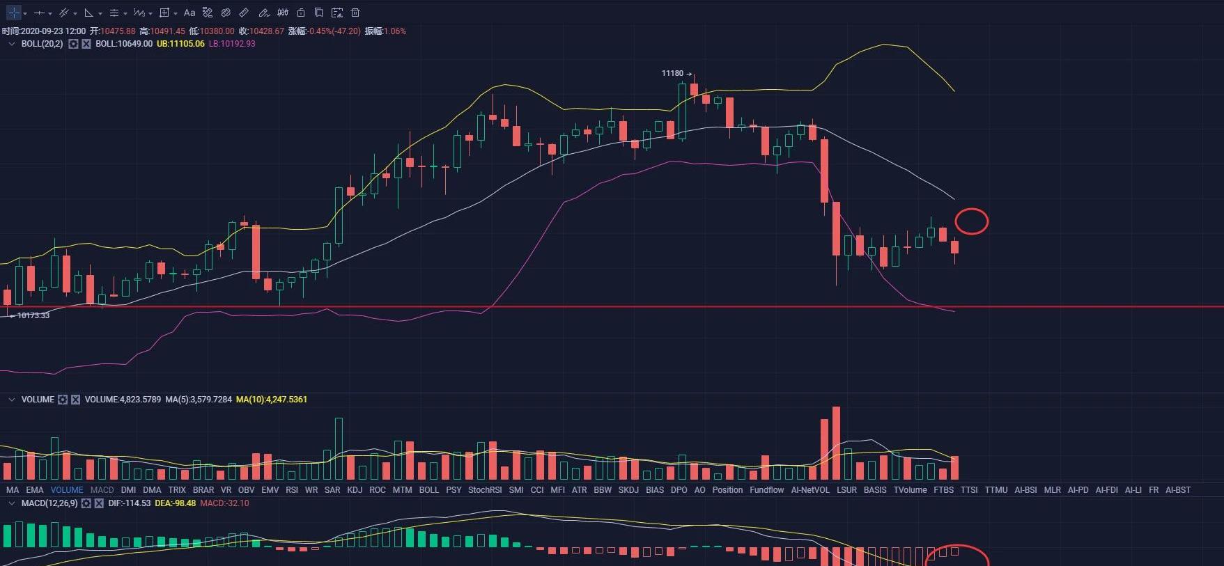 走勢偏弱的行情令整個市場人氣不斷外流,而在此時,國外大型投資機構灰度投資在不斷囤積比特幣現貨,受該因素影響,到了7月末,比特幣打破價格的桎梏,突破了10000美元。而就在此時,幣市下半年最大的熱點DeFi就此出現了。從DeFi嶄露頭角到現在也只不過是兩個月左右的時間,而在DeFi最熱鬧的上半場,即整個八月份。比特幣選擇了作壁上觀。比特幣真正上漲的階段是在7月20號—8月2號期間,從9200美元漲到了12100美元,而從8月2號的12100到8月17號最高的12448只漲了300多美元,卻用了半個月,可以說,整個8月份,比特幣大部分時間的活動區間是在11000-12000美元。但也正是比特幣這段時間按兵不動,才為DeFi塑造了爆發的環境,在11000-12000美元之間的高位令整個幣市處于高昂的狀態中,但同時不動的話又沒有進一步的抽取資金,反而令閑散資金流進DeFi項目中,為DeFi的發展提供肥料。在整個8月份期間,眾多DeFi項目星光閃耀,一開始的Compound、Balancer,中期瘋狂的Link,國產公鏈在上半場的尾部也是小爆發了一把,中間波卡也正式上線且其代幣Dot還小炫了一把,進行了拆幣,但隨后又迅速的被DeFi項目打壓下去,YFI又起來了,價格一度超越比特幣3-4倍,Sushiswap仿制Uniswap的成功更是掀起了項目仿制的風潮,如果說DeFi上半場是借貸挖礦、去中心化交易所、預言機等項目百花齊放,那到了下半場便完全是去中心化交易所在表演,隨著近期第一大去中心化交易所Uniswap的上幣,仿佛給近幾個月DeFi的瘋狂收了個尾。可以看出來,短短兩個月左右的時間,DeFi的節奏輪動的非常快,說是令人目不暇接也不為過,到后期,基本上不管是什么項目,只要是能發幣的能挖礦的,都會引起大批礦工哄搶。到了目前,許多項目基本上已經是以垃圾項目為主,第一天幣是這個價格,第二天的幣價是第一天的10%,第四天又是第二天的10%,許多礦工現在挖礦基本上是幣價不抵手續費的狀態。但當前DeFi可能性的結束,對于市場的某些群體來說并不是壞事,他們就是所謂的“老韭菜”,DeFi火爆的時候他們全程沒有參與,并不是因為不懂,而是想要了解規則太麻煩,幣圈有很多投資者交易只是副職,沒有那么多的時間和精力去參與和了解新規則。但這也并不是壞事,因為許多參與的投資者也不是參與的直接挖礦,正常情況上講,挖礦肯定挖不過那些早有準備的大戶,最后可能還因為手續費過高而有所損失,其次參與DeFi代幣二級投資市場的基本上是以虧損為主,很多時候市場只是看著熱鬧而已,真正能落袋為安的還是少之又少。今年還剩下100天時間,其實也不算短,足以讓一個新的DeFi從開始走向巔峰再走向衰弱,接下來還有沒有新的DeFi還是問題。但就我們當前能看到的,還是有概率出現新的熱點。其中一個是Filecoin,Filecoin在今年5-6月份的熱度堪比DeFi,只是后面DeFi異軍突起,Filecoin也沒了聲音,再后來就說延期到11月份上線。這個項目還是有機會再炒一下的,畢竟5-6月份的時候云礦機云算力炒的飛起,不繼續炒的話就砸手上了。另一個便是ETH2.0,ETH2.0的意義其實不必多說,擴容是當前ETH的重中之重,每當鏈上火爆的時候就會發生擁堵,Gas費也飛速上升,這也令ETH2.0成為市場對以太坊最新的期望,而之前V神也反復強調過,ETH2.0會在今年年底上線。關于接下來的比特幣,需要關注外圍市場的影響,近期,比特幣價格受外圍市場影響非常大,而有這個印象先入為主后,接下來被繼續綁定的概率也是非常大,不出意外的話,以后大家炒幣可能要開始關心國際環境了。回到行情上,今天行情走的比大家想象中的要弱,昨天價格最高時到達10575美元,而今天開盤后沒有絲毫向上試探的意思就開始回落,截至目前為止,今天的跌幅基本上已經覆蓋了昨天的漲幅。從日線級別的布林帶上看比較清晰,昨日行情重新漲到中軌附近被壓制,但離站上中軌僅剩一步之遙,也不是說今天一定要重新站上中軌,但試探一下的概率還是比較大的,不成想直接開盤就回落。