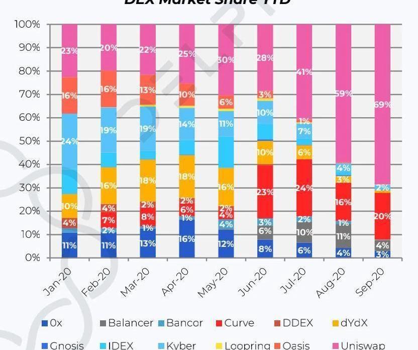 各DEX交易量對比除用戶數量和交易量表現外,Uniswap的市場份額也從今年1月份的23%激增至本月的近70%。