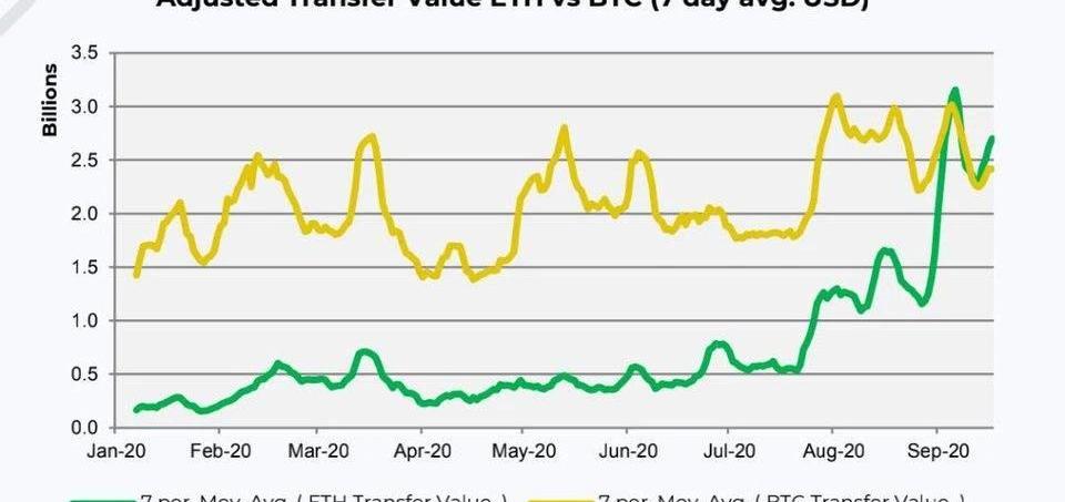 以太坊網絡活躍地址和交易次數統計9月份,以太坊鏈上7天平均調整后轉移價值在2018年以來首次超過了比特幣。