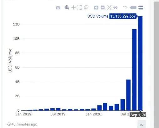 今年下半年以來,DeFi生態中的去中心化交易所來勢洶洶。以太坊數據分析平臺DuneAnalytics數據顯示,從6月開始,去中心化交易所的交易量迅猛增長。至9月初,其每月總交易量,已從15.79億美元升至131.35億美元,三個月間飆漲731%。其中,僅交易所Uniswap的交易量,就在一個月內實現了283%的漲幅。