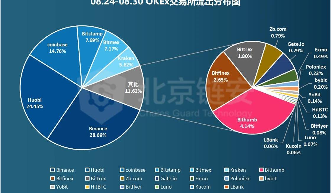 從數據來看,火幣交易所雖然繼續維持凈流出狀態,但是在持續的大幅凈流出之后,其凈流出較之前一周凈流出下降66.39%,凈流出額度大幅收窄,火幣能否再接再厲,在接下來將周凈流出轉為凈流入呢?讓我們期待下一周數據解析。三大交易所流出分布:在過去一周,交易所之間的比特幣來往又呈現怎樣的分布呢?我們將幣安、火幣、OKEx三大交易所流出到各交易所的比例在這里也向各位呈現。