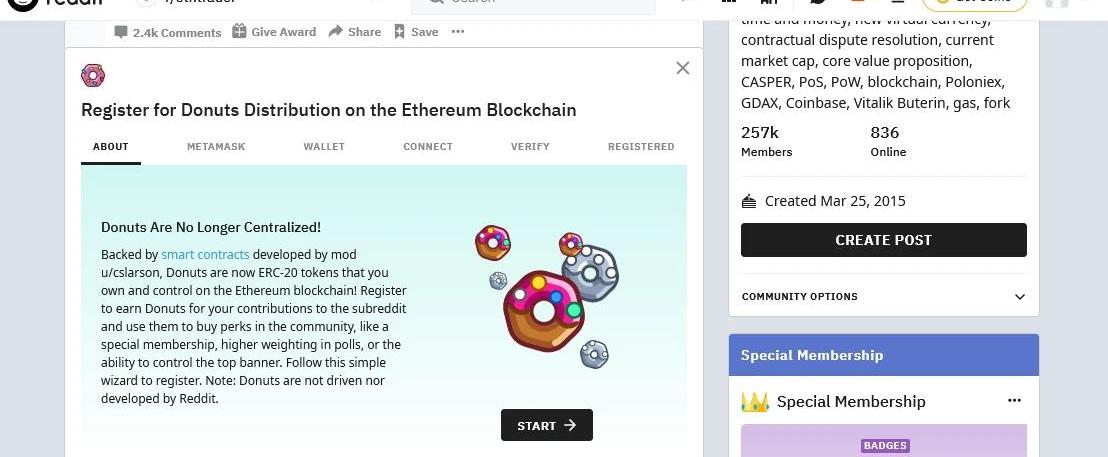 關于Reddit:也許你不一定了解Reddit,但你一定在某個時間看到過Reddit上的meme,或者它的外星人logo。這家誕生于2005年的社交平臺吸引著大量的年輕人,2018年流量已排到全球第四,并在今年五月正式開始接入基于以太坊測試網的社區積分系統。關于Donut:幾個月前隨著Reddit測試以太坊的新聞鋪天蓋地,細心的用戶發現,其實在此之前已經有一個板塊作為Reddit和以太坊的第一次嘗試,已經成功的將其積分與以太坊主網掛鉤并發布了一個新的ERC-20Token,名叫Donut,同時在Aragon上發起了社區治理的DAO,EthTraderDAO。