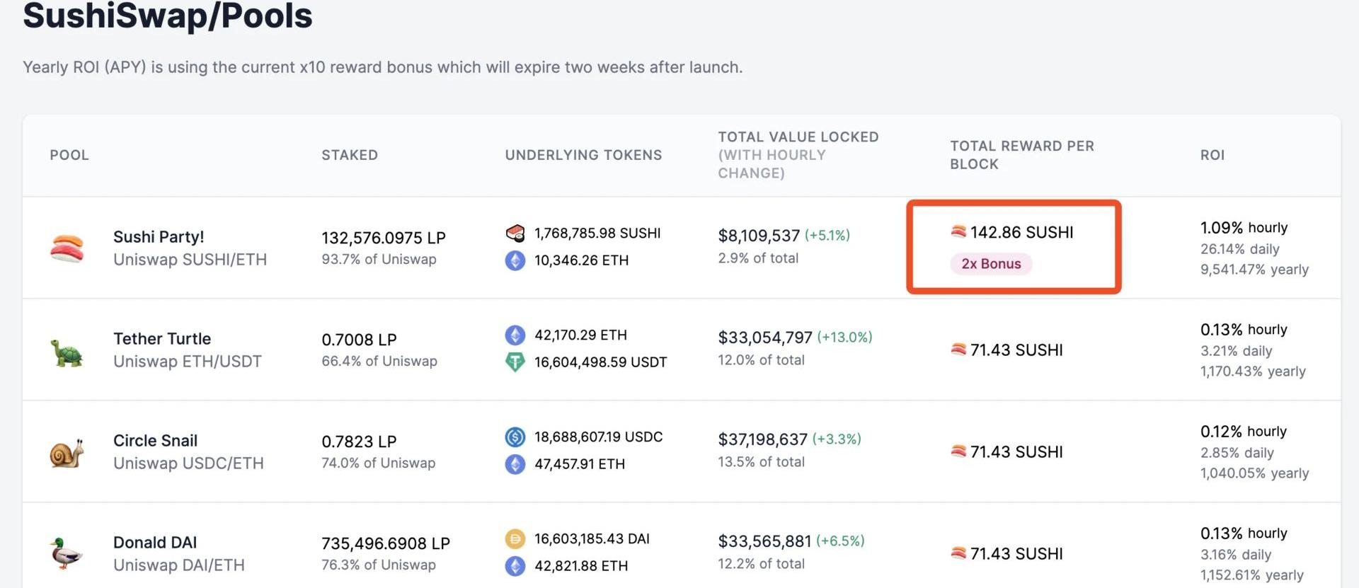 為了鼓勵大家使用SUSHI,項目方將SUSHI/ETH這個池子設計為2倍獎勵,據此計算,年化暫時高達9500%。