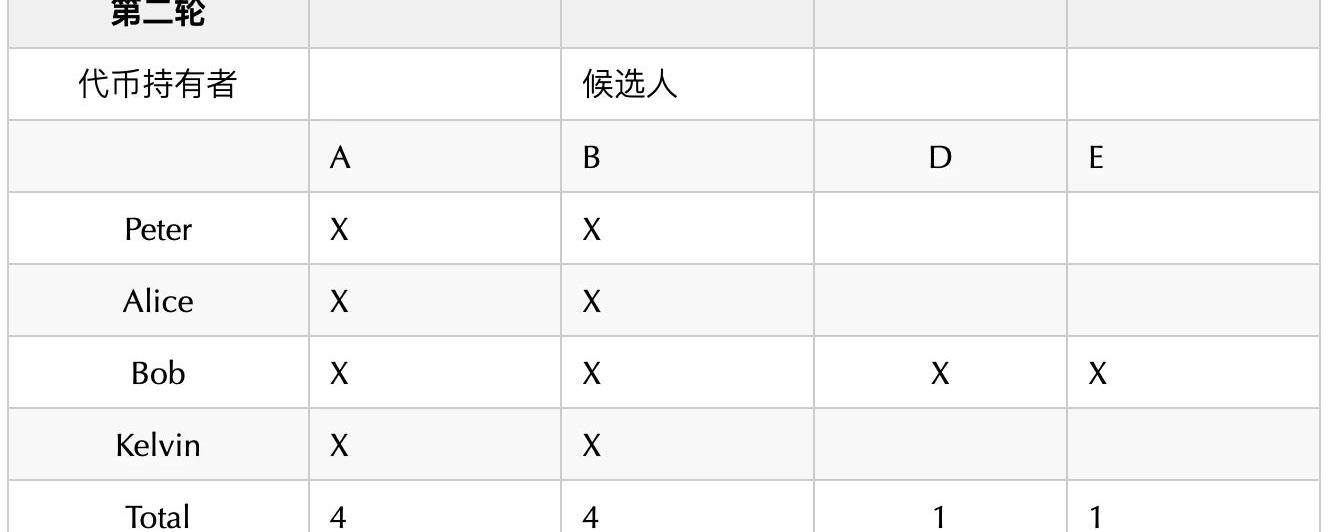 目前,理事會有13個席位。所有利益相關者可以自由表示對任何注冊候選人的認可。理事會的選舉由同一Phragmén選舉流程處理,該流程根據提名從可用池中選擇驗證人。但是,代幣持有人對議員的投票,與他們對驗證人的任何提名是分開的。理事會任期為一日。每一期的末尾,將運行Phragmen選舉算法,結果將根據所有選民的投票配置選擇新的議員。選舉還選擇了一定數量的備選議員,目前在Kusama上為7名,在Polkadot上為15名,這些候選人將在投票中保持原樣。與“先行任職”相反,Phragmén選舉是表達選民觀點的一種更具表達力的方式。代幣持有者可以將其視為“是或否”投票,可以支持你想支持的盡可能多的候選人。選舉算法將找出一個與選民整體表達的指示緊密匹配的候選人的子集。讓我們看下面的例子。第一輪