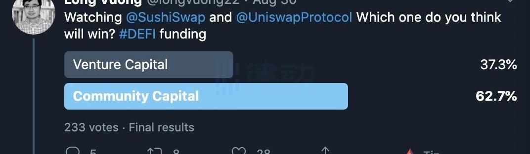 回想一下最近的DeFi運動,一開始是去中心化對抗中心化,現在這場對抗已經告一段落,DEX日均8億成交量,DeFi鎖倉超過100億美金,一切數據已經說明這場DeFi運動有了不小的成績。現在的DeFi運動分成了兩派,VC幣和社區幣。這兩派的標志性區分,就是代幣是否充分分發。近日有相當多的大V和意見領袖質疑一些被VC投資的協議/去中心化交易所,分配給挖礦的份額過少,讓社區資本都給早期VC投資人打工。不難看出,這是一場蓄勢已久終于爆發的爭論。Tomochain創始人在推特上關于VC還是社區資本會贏的投票,社區資本以62.7%的票數勝出。