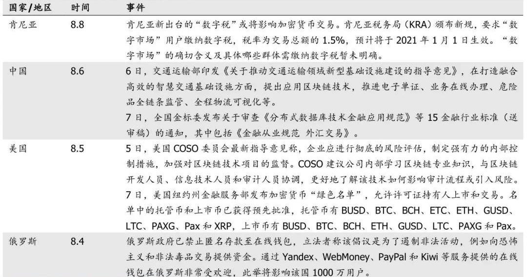 肯尼亞:肯尼亞新出臺的“數字稅”或將影響加密貨幣交易。肯尼亞稅務局頒布一項新規定,要求“數字市場”的用戶繳納數字稅,稅率為交易總額的1.5%,預計將于2021年1月1日生效。當地一份報道指出,現階段“數字市場”的確切含義及具體哪些群體需繳納數字稅仍不清楚。中國:交通運輸部推動利用區塊鏈技術打造智慧交通,金標委審查分布式數據庫等金融行業標準。6日,交通運輸部印發《關于推動交通運輸領域新型基礎設施建設的指導意見》,在打造融合高效的智慧交通基礎設施方面,提出應用區塊鏈技術,推進電子單證、業務在線辦理、危險品全鏈條監管、全程物流可視化等。7日,全國金標委發布關于審查《分布式數據庫技術金融應用規范》等15金融行業標準的通知,其中包括《金融從業規范外匯交易》。美國:美國反虛假財務報告委員會下屬COSO委員會督促企業加強對區塊鏈項目的監督。5日,COSO最新指導意見稱,企業應進行徹底的風險評估,制定強有力的內部控制措施,加強對區塊鏈技術項目的監督。COSO建議公司內部學習區塊鏈專業知識,與區塊鏈開發人員、信息技術人員和審計人員協調,更好地了解該技術如何影響審計流程或引入風險。7日,美國紐約州金融服務部發布加密貨幣“綠色名單”,允許許可證持有人上市和交易,名單中的托管幣和上市幣已獲得預先批準。
