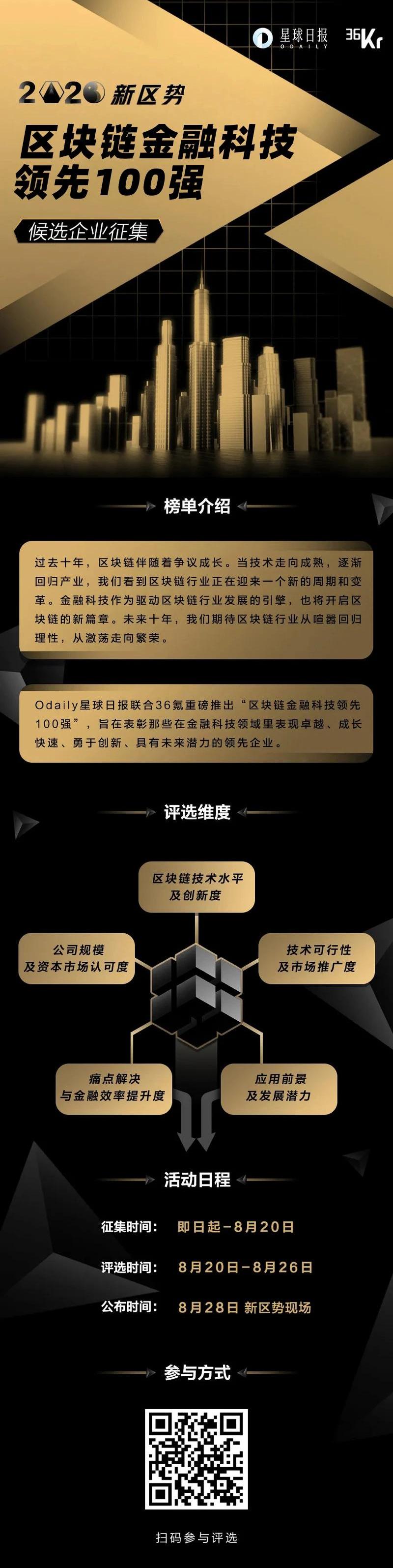 除了傳統金融機構入場,在金融領域建設過程中也涌現了一批成長型的創業公司。它們一同成為市場發展和變化的參與者和見證者,在區塊鏈與金融科技領域中,不斷的自我革新、推陳出新。在這個混亂而充滿生機的世界,領袖式的企業和項目不斷出現,沖擊和更新著我們的認知。“產業區塊鏈需要更多成功的商業應用。有了標桿和完整的閉環,才能讓更多的企業跟進來,從而促進整個產業的繁榮,激發行業拐點的到來。”也就是說,有了標桿就有了可以復制、推廣的范本,行業也將因此擴展。基于此,Odaily星球日報對全行業檢索和調研,重點關注這些深耕在金融科技領域的公司們,聯合36kr權威發布FAT「區塊鏈金融科技領先100強」。該榜單聚焦趨勢價值,著眼商業未來,旨在表彰那些在金融科技領域里表現卓越、成長快速、勇于創新、具有未來潛力的領先企業。「FAT」年中榜單,聚焦「價值」與「公信力」「FATBlOCKCHAINAWARD」榜單聚焦價值與公信力,聯合區塊鏈權威公司與機構公布發布,FAT「區塊鏈金融科技領先100強」通過報名征集、調研等方式評選出在區塊鏈金融科技領域里的100家優質企業。全面考量,五大維度綜合評選公司規模及資本市場認可度區塊鏈技術水平及創新度技術可行性及市場推廣度痛點解決與金融效率提升度應用前景及發展潛力我們希望從金融場景里探索“區塊鏈技術”的未來趨勢,從多維角度出發,共話那些不斷“向上而生”的企業與區塊鏈背后的新興商業力量。重磅榜單,「新區勢」現場發布經過篩選、調查評估等一系列過程,2020FAT「區塊鏈金融科技領先100強」榜單將于「新區勢——區塊鏈金融科技峰會」現場發布,屆時為在場的國內眾多金融機構提供客觀參考依據。我們邀您一起見證他們的榮耀!