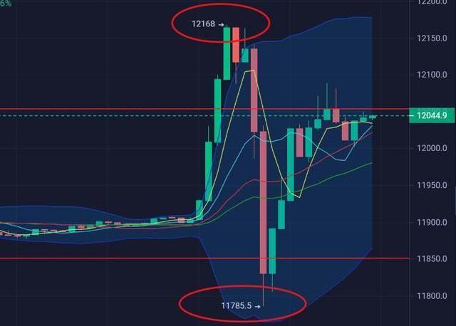 昨日晚間10點開始,大餅一支獨秀上演了跳水動作,幣價自12000美元短時暴跌400點,最低觸及到11826附近后反彈,半小時后卻暴力拉升至12000美元,再過半小時則再度下探11800美元……幾個回合殺得多軍、空軍措手不及。