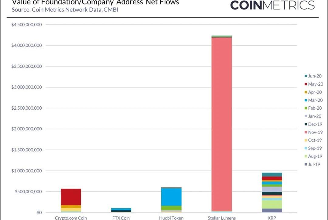 注1:2020年3月,火幣基金會燒銷毀價值4.22億的HT。注2:2019年11月,恒星基金銷毀了價值41.4億元的XLM。2020年第二季度期間,轉移到確定的公司團隊地址之外的加密資產凈值為940萬美元,低于上一季度的3200萬美元。然而,在第二季度有6700萬美元的CRO存入Crypto.comCoin團隊地址,如果沒有這些CRO,移動到公司團隊控制地址之外的加密資產凈值將為7650萬美元。注:移出團隊控制地址并不一定意味著資產已被出售,而可能是活動的跡象。