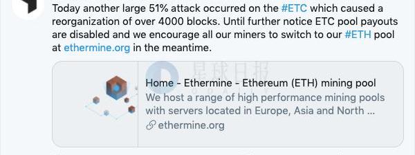 XRP/HKD-1.06%8月6日11時許,礦商Bitfly發推稱,繼8月1日之后,ETC再遭大規模51%攻擊,目前已導致4000多個區塊發生重組,但出塊正常。