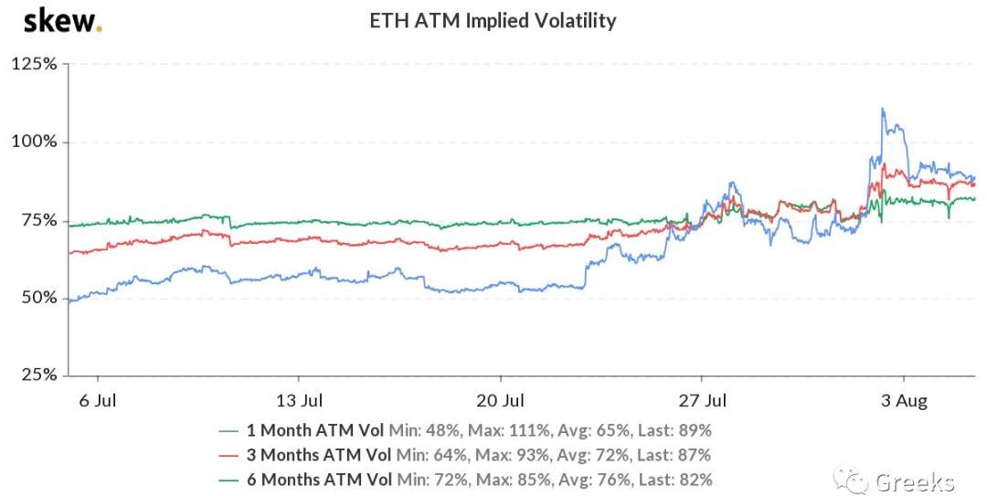 ETH歷史波動率10d103%30d73%90d70%1Y102%以太坊今日期權持倉量達到3.33億美元,再創新高。以太坊期權交易量有所下降,賣put占了將近一半的交易量,特別是390put。各標準化期限IV:今日:1m89%,3m87%,6m82%8/4:1m92%,3m87%,6m80%以太坊IV繼續維持昨日水平,長期IV被賣的非常低,短時間恐怕難以回歸。