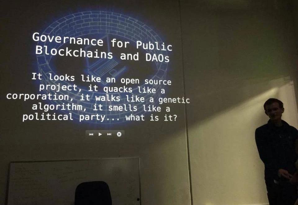 以太坊創始人Vitalik2016年初在會議中介紹DAO以太坊用戶當時蜂擁進禮堂,聆聽DAO將如何代表未來治理模式的演講。演講中宣稱,這與傳統的閉門型公司不同,DAO將會讓治理高度透明,DAO代表了在傳統治理體上逐步的職能改善。DAO還宣稱「自動化在中心,人在邊緣」,揚言讓這個世界變得更協調、更高效。不管我們愿不愿意,都要被DAO拖進未來。