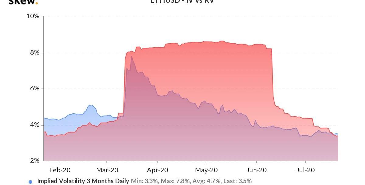 來源:Skew然而,這一次,購買期權是最有利的交易之一。ETH隱含波動率處于歷史最低點,而實際波動率則徘徊在年度最低點附近。隱含波動率是由BlackScholes期權定價公式確定的變量,而實際波動率是實際的歷史波動率。