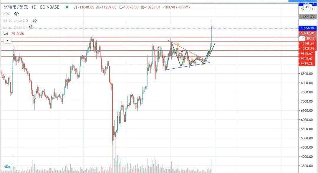 XRP/HKD+0.39%編者按:本文來自Cointelegraph中文,作者:LARRYSHI,Odaily星球日報經授權轉載。比特幣昨天早晨站上11000美金之后,正如我們預測的,上午還是往上沖了一波,然后在高位橫盤,下午開始回調收網,Coinbase價格一度跌到10575美金,晚間又重新站上11000美金。BTC選擇了用這種快速回調的方式,回踩確認了10500美金的有效支撐位,之后又快速反彈回到11000美金附近震蕩修復指標,整體走勢依然強勁,基本沒有下跌的動能。