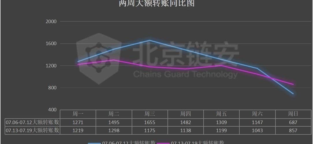 大額轉賬數:07.06-07.12:904607.13-07.19:7929較之前一周下降:12.35%詳細數據圖如下: