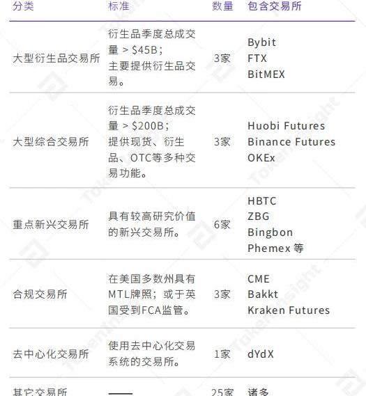 20Q2前八位衍生品交易所市場占比與上季度對比,來源:TokenInsight4.2交易所分類標準“數字資產衍生品行業賽道細化,不可一概而論當前,各數字資產衍生品交易所已在產品、用戶、地域等方面出現了明顯差異。例如,以HuobiGlobal/HuobiFutures等為代表的大型交易所在現貨、衍生品和OTC等多角度全面發展;以Bybit等為代表的專業型衍生品交易所則全力發展合約交易;以Bakkt等為代表的交易所著重合規體系搭建。而一些當前成交量較低的新興交易所,也均具有獨到之處;甚至去中心化交易所dYdX也已上線了BTC永續合約。不同交易所發展規劃側重角度差異頗大,因此,對于數字資產衍生品交易所的分析,使用同類交易所比較更為具有實際意義。TokenInsight將本次報告涉及的42家數字資產衍生品交易所按以下標準分類。
