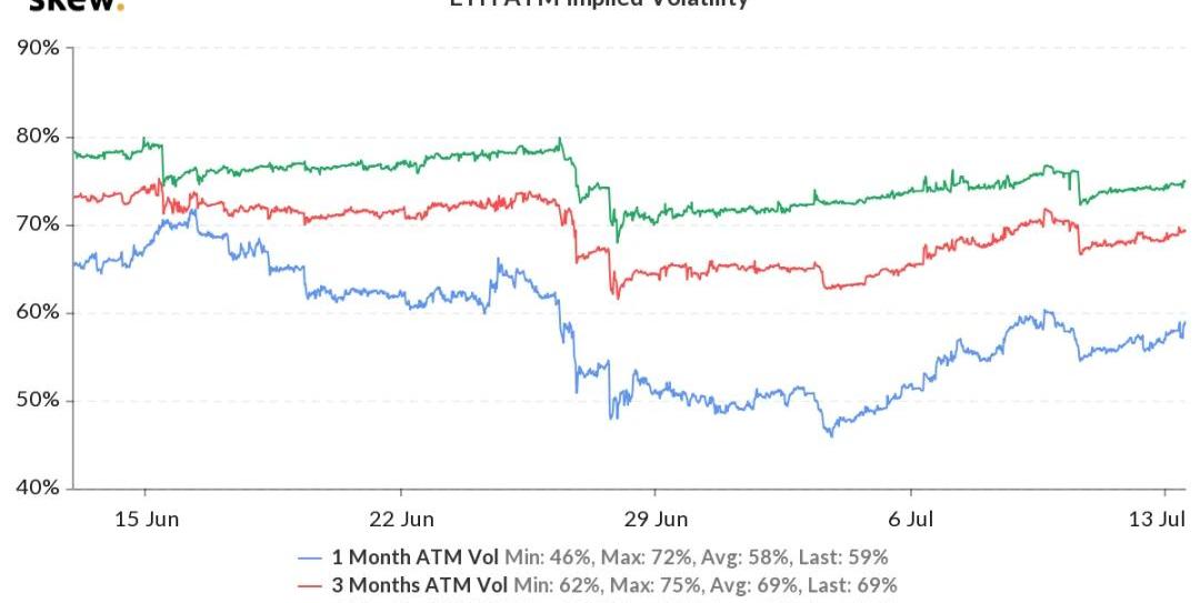 持倉量1.52億美元,持倉量上升,已經接近季度交割前的持倉量。交易量穩定。各標準化期限IV:今日:1m59%,3m69%,6m75%7/12:1m56%,3m68%,6m74%隱含波動率相對平穩,正在緩慢拉升。