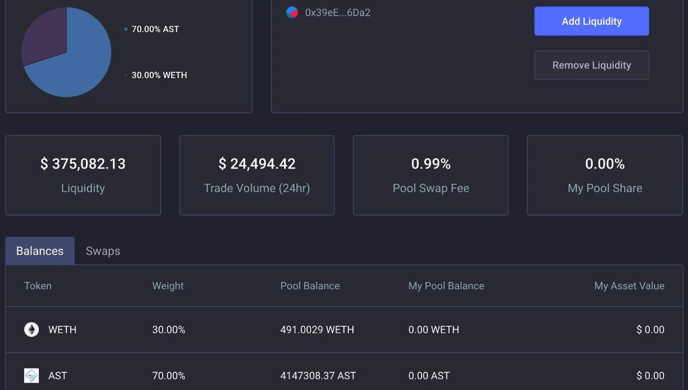 以一個70%AST/30%WETH的儲備池為例。在撰寫本文時,該儲備池有414.7萬AST和491WETH: