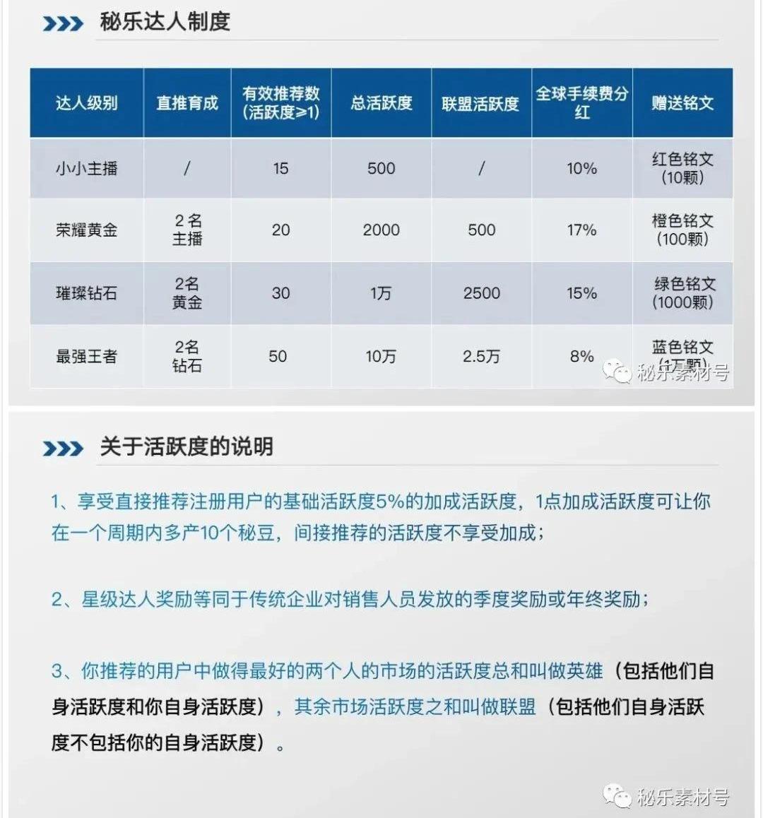 △秘樂提現手續費通過降低手續費這一步,秘樂就成功的將“一個人的薅羊毛之旅”變成了“全家五口齊上陣”的局面。如果家人只是簡單注冊,每日刷視頻,什么都不做的話,那么一家五口一年的收益就是3841*4+5531=20895元。為了提升用戶拉新、推廣秘樂的積極性,秘樂相應推出了享全球手續費分紅的達人制度,加大吸引籌碼。達人設四個等級,由下至上分別是小小主播、璀璨鉆石和最強王者。以小小主播為例,直推15人,團隊總活躍度大于500,活躍度與團隊成員持有的銘文數量有關,即可坐享全平臺用戶從秘豆提現成秘寶的手續費分紅的10%。